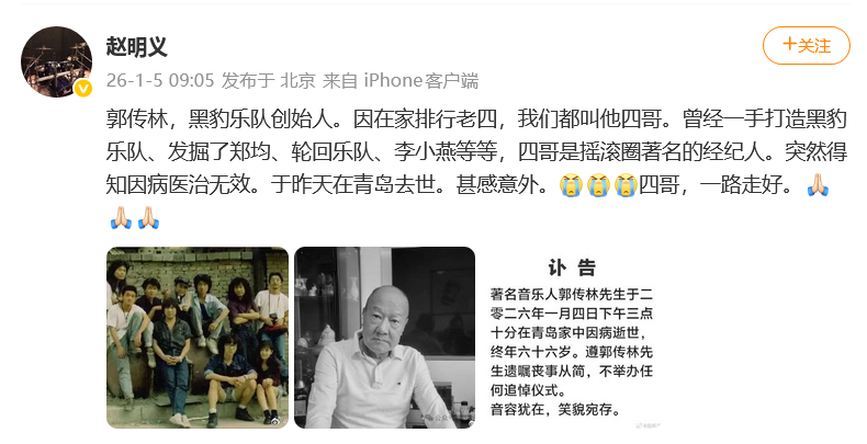 据中国蓝新闻消息,1月5日,黑豹乐队官方微博发文:黑豹乐队创始经纪人、著名音乐人郭传林先生于2026年1月4日下午因病逝世,终年66岁。四哥,一路走好。